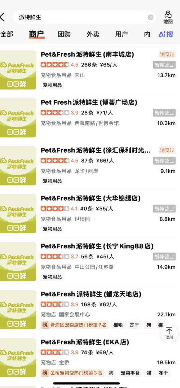 虎嗅在大众点评App上海区域搜索“派特鲜生”,目前能搜到17家门店,多家已显示“暂停营业”。