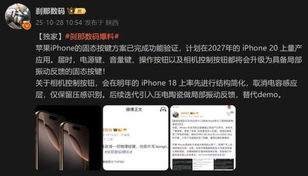 博主刹那数码此前曾补充表示,iPhone 20的电源键、音量键、相机按钮以及多功能操作按钮等机身按键都将改为固态按键,取代传统机械按键,进一步实现无孔化。