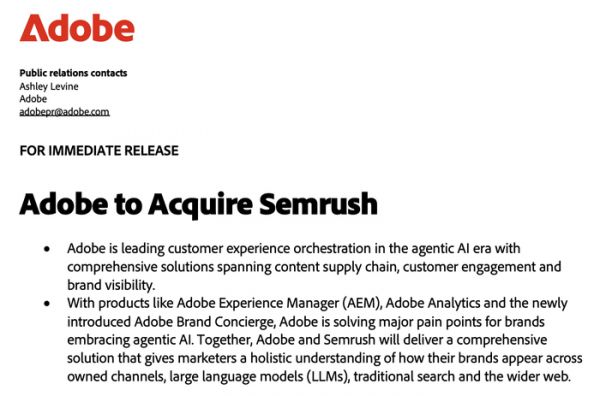 Semrush的工具将整合进Adobe的数字体验业务,用于跟踪搜索和AI平台的可见度。未来,Adobe将与Semrush共同构建解决方案,让营销人员全面了解品牌在自有渠道、大语言模型、传统搜索及更广泛的互联网中的形象。