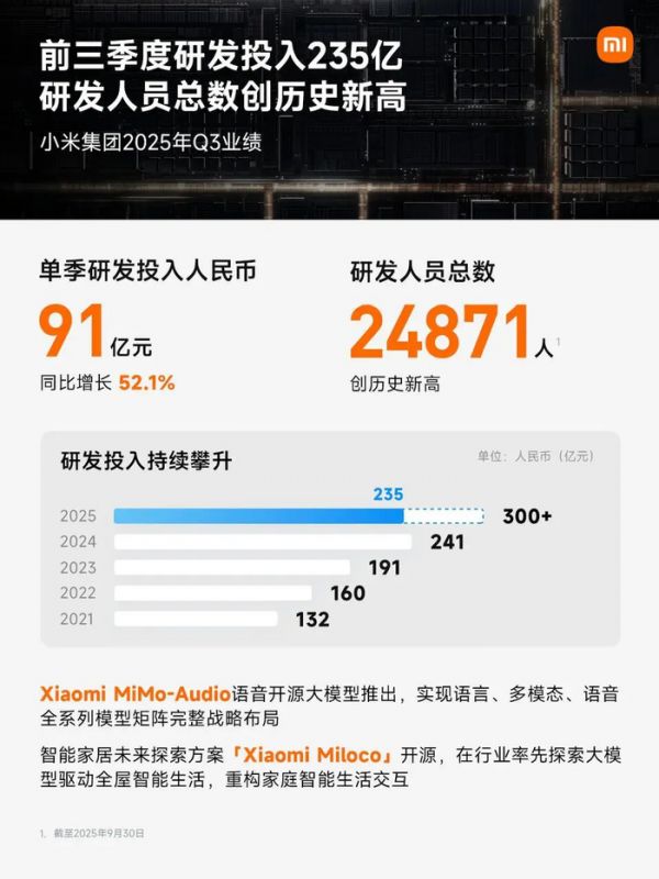在让人侧目的营收利润增长之外,小米第三季度在研发方面的投入,一点也不吝啬,第三季度单季研发投入91亿元,前三季度累计已投入235亿元,预计全年投入超300亿元。研发人员总数24871人,创历史新高。
