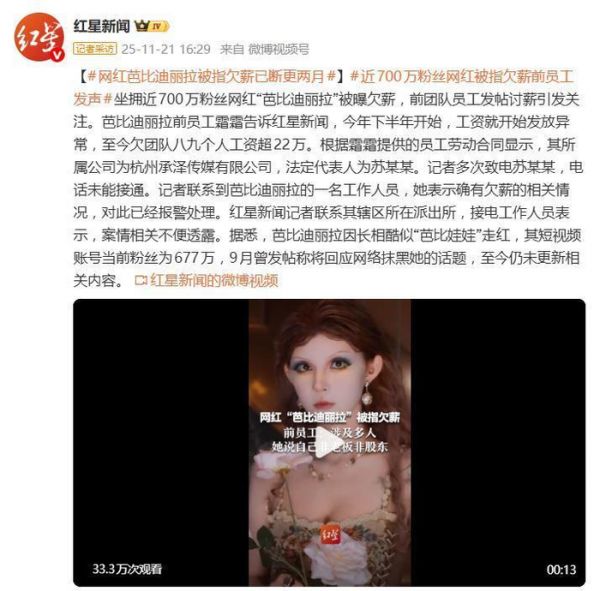 坐拥近700万粉丝的网红“芭比迪丽拉”,最近人设有点崩。不是因为妆容翻车,也不是因为滤镜失灵,而是被自家团队员工公开“挂”上了网——拖欠9名员工薪资超22万元、短视频账号断更两月、直播收益疑被转入私人账户……这场“讨薪罗生门”迅速在网络炸开了锅。