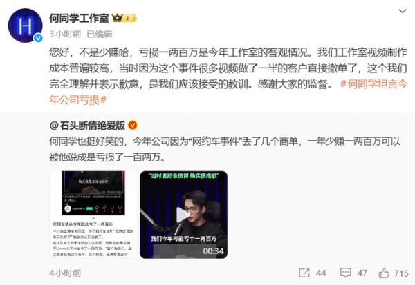 11月20日,科技博主何同学在罗永浩播客访谈中自曝公司今年可能亏损一两百万,原因竟是4月一条关于网约车司机的微博引发争议。这条微博不仅让他陷入舆论漩涡,更让公司合作项目接连撤单,损失惨重。