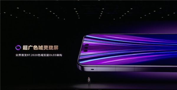 正面为超广色域灵珑屏,双层OLED架构,首发全链路BT.2020超广色域。