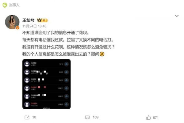 11月24日,杜淳的妻子王灿在社交平台公开发文求助,称自己的身份信息被人盗用开通了花呗,本人从未操作过,却要每天忍受催收电话的连环轰炸。即便拉黑了号码,对方也能换着不同的电话再次打来,严重干扰了她的正常生活。她无奈发出质问:这种情况该如何避免骚扰?她的个人信息到底是怎么泄露出去的?