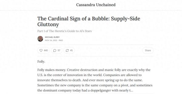 他在一篇名为《泡沫的根本标志:供给侧贪婪》(The Cardinal Sign of a Bubble: Supply-Side Gluttony)的文章中指出,人工智能的繁荣是一种“辉煌的愚蠢”,并指出英伟达是他预计该行业泡沫何时破裂的先兆。