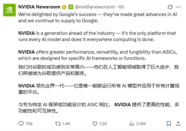 英伟达在社交平台上发文称:“我们对谷歌的成功感到高兴,他们在人工智能方面取得了巨大进展,而我们也将继续向谷歌供货。英伟达领先行业整整一代,也是唯一一个能运行所有AI模型、并在所有计算场景中部署的平台。”