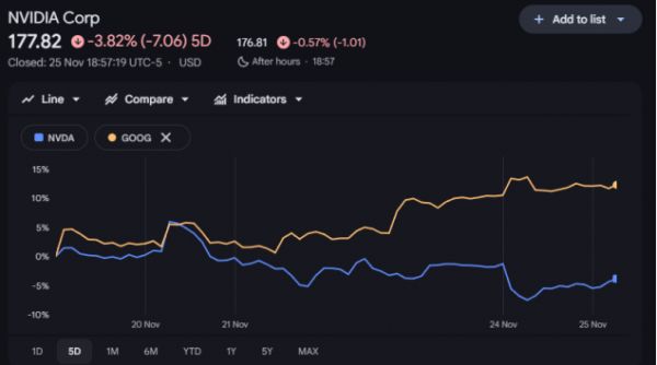 英伟达与谷歌过去 5 日股价走势对比谷歌发言人则在声明中表示,其定制的TPU和英伟达GPU的需求都在加速增长,并将继续支持两者。这一表态凸显了大型科技公司在AI基础设施上寻求多元化供应的策略,这也正是英伟达投资者最担心的趋势之一。