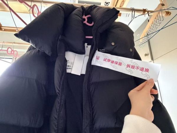 “今年买羽绒服,头一次在衣服上看到这么大的吊牌。”“双十一”期间,市民张女士在淘宝购买羽绒服,收到货后发现羽绒服的胸口上缝着一个巨大的标签,上写“试穿请保留,拆毁不退换”,令她感到十分新奇。