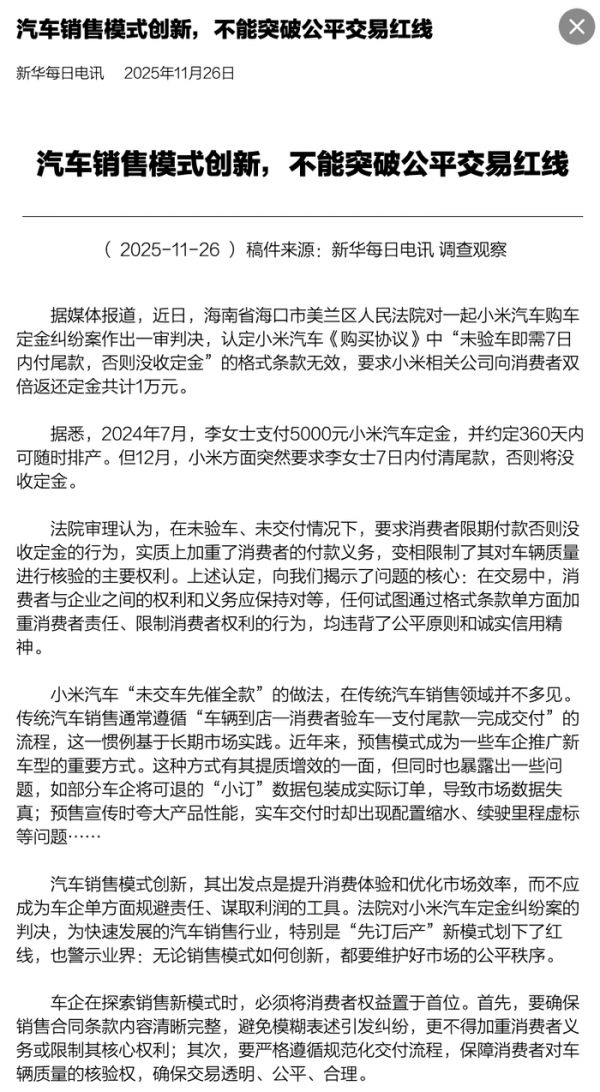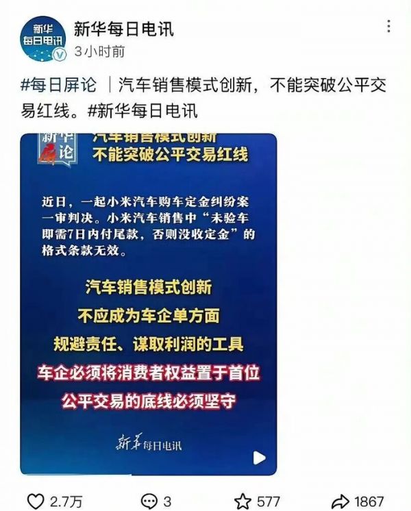 谁也没料到,11月26日新华社每日电讯刊登本报评论员邱犇的文章,直接把矛头对准小米汽车:“汽车销售模式创新,不能突破公平交易红线”。