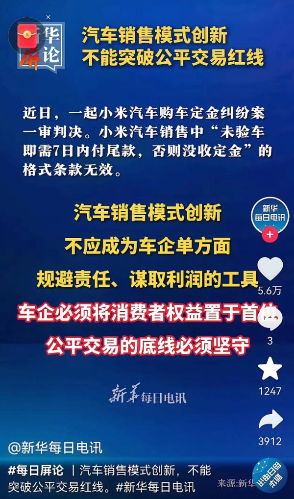 可这种把风险全甩给消费者的“小聪明”,刚好撞在了“保护消费者权益”的枪口上。评论里那句“公平交易的底线必须坚守”,更像是给所有跨界车企敲了个警钟:哪怕手机卖得再火,卖车的规矩也不能自己瞎定。