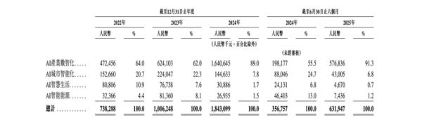 2022-2024年及今年上半年(下称:报告期),特斯联来自AI产业数智化的收入分别约4.72亿、6.24亿、16.41亿、5.77亿元,占总收入的比例分别为64.0%、62.0%、89.0%、91.3%。今年上半年,特斯联的AI产业数智化业务收入同比上涨191%,成为营收增长的全新引擎。