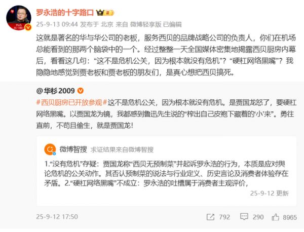 其实这并非罗永浩与华杉的首次交锋,今年9月10日,罗永浩发微博吐槽西贝几乎全是预制菜却售价昂贵,引发了西贝预制菜风波。