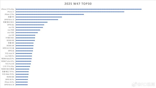 快科技11月29日消息,博主“RD观测”最新发布了2025 W47(即11月17日-11月23日)的国内手机销量TOP30榜单。