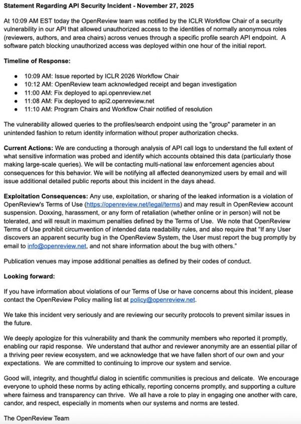 北京时间 11 月 27 日晚,国内 AI 社区全数炸锅。在学术论文审稿最常用的 OpenReview 平台上,一个前端 bug 导致数据库泄露,让原本的双盲评审变成了明牌。
