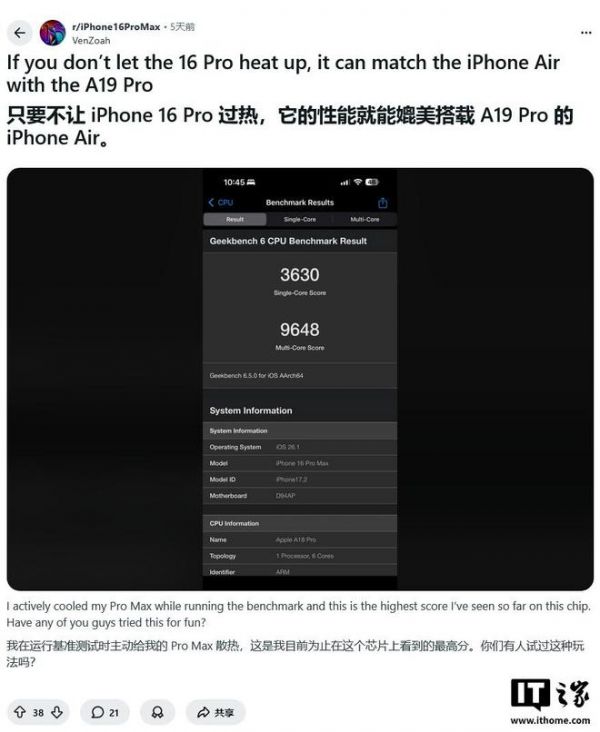 IT之家 11 月 28 日消息,Reddit 用户 VenZoah 昨日(11 月 27 日)发布测试数据显示,上一代旗舰 iPhone 16 Pro Max 在采用主动散热措施后,其搭载的 A18 Pro 芯片性能可媲美甚至超越新款 iPhone Air 搭载的 A19 Pro(降频版)。