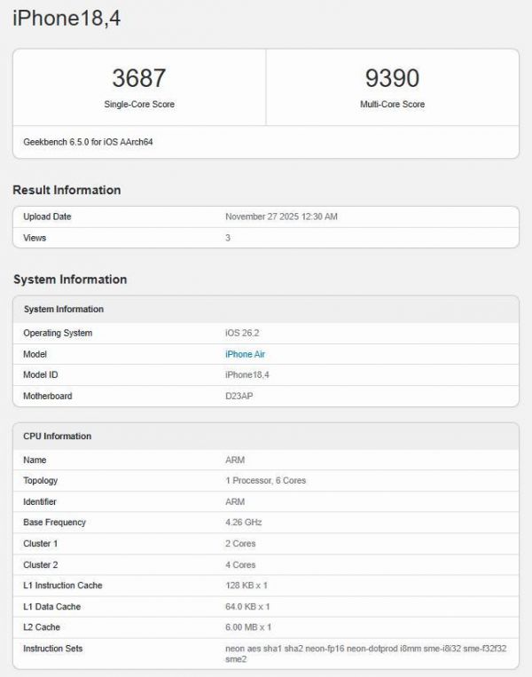 作为对比,新款 iPhone Air(搭载 6 核 CPU 和 5 核 GPU 的 A19 Pro)在常规被动散热下的成绩为单核 3687 分、多核 9390 分。这组数据直观地证实,解除温控限制后的 A18 Pro 在多核性能上反超了 A19 Pro。