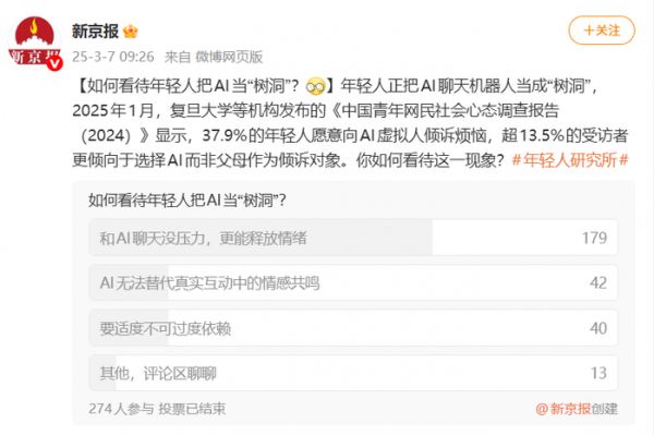 复旦大学等机构也在今年发布《中国青年网民社会心态调查报告(2024)》,当中显示37.9%的年轻人愿意向AI虚拟人倾诉烦恼,超13.5%的受访者更倾向于选择AI而非父母作为倾诉对象。