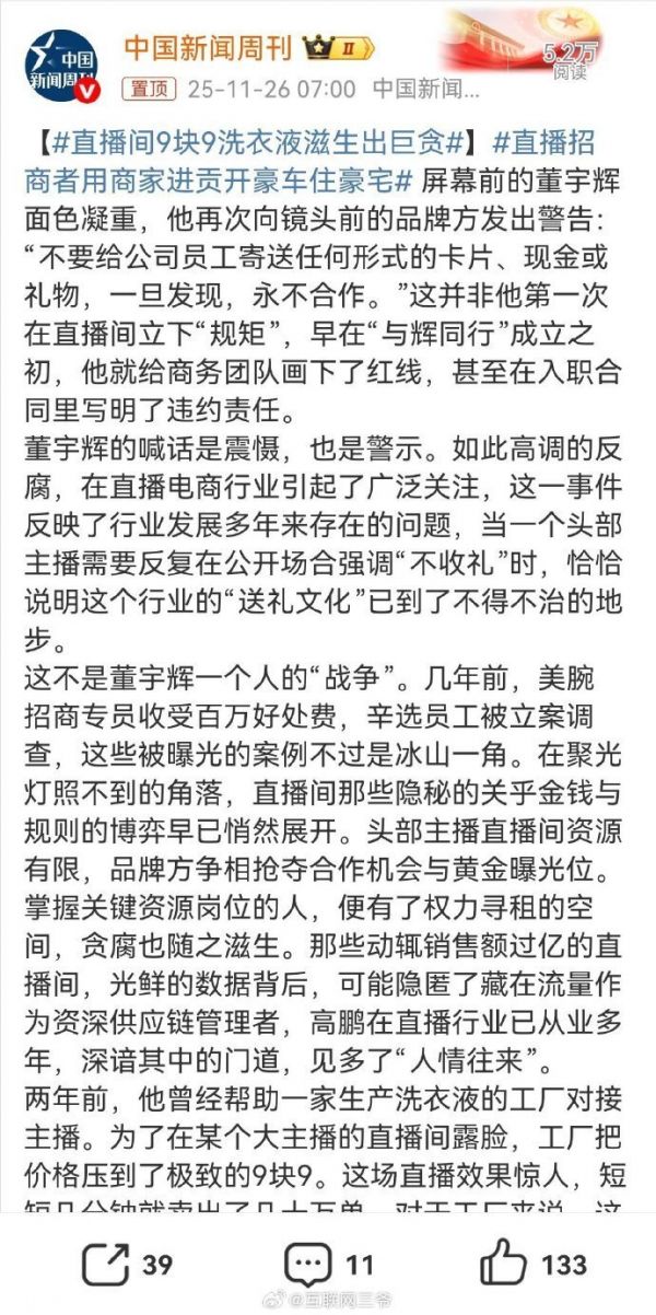 从9块9洗衣液中滋生的“巨贪”,到头部主播三令五申的廉洁宣言,直播电商行业正站在一个十字路口。当最基本的诚信与公平都需要通过最严厉的警告来捍卫时,这场关乎行业健康发展的自我净化,显然已刻不容缓。