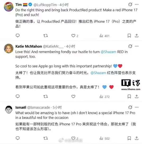 在缺席了 iPhone 15 和 16 两代产品后,粉丝对红色回归的渴望已投射到下一代机型上。评论区中甚至出现了由 Grok 生成的“红色 iPhone 17 Pro”AI 概念图,用户 Ismaël 评论道:“如果苹果能借此机会推出一款绝美的红色 iPhone 17 Pro,那就太好了”