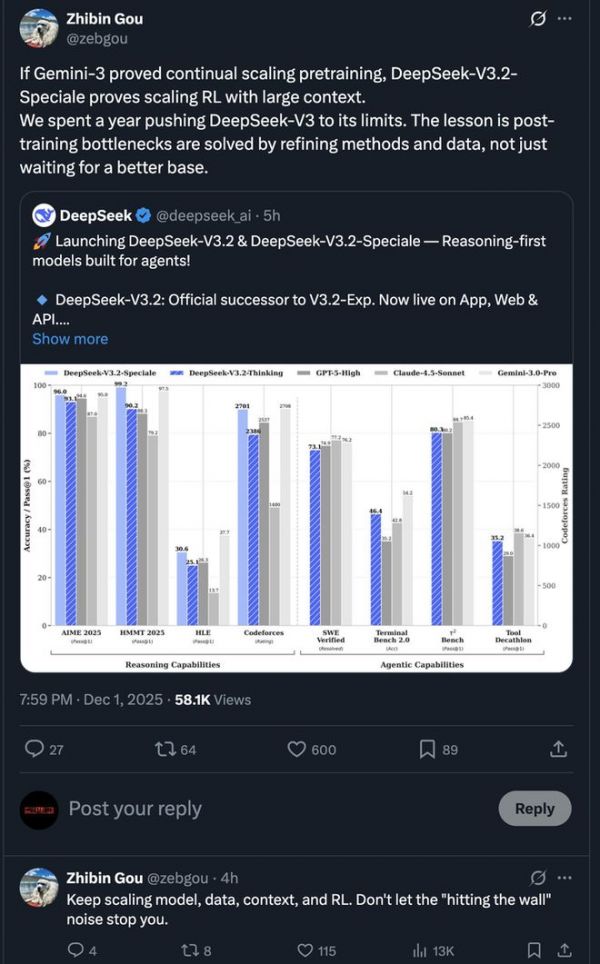 “如果Gemini-3证明了持续扩展预训练的可能性,DeepSeek-V3.2-Speciale则证明了在大规模上下文环境中强化学习的可扩展性。我们花了一年时间将DeepSeek-V3推向极限,得出的经验是:训练后的瓶颈需通过优化方法和数据来解决,而非仅等待更好的基础模型。”
