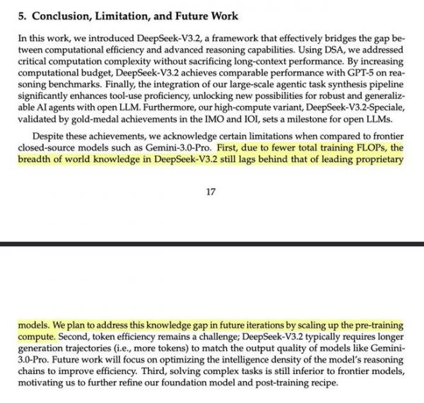 有网友评论说,每篇DeepSeek论文最重要的部分永远是“结论、局限性与未来工作”部分。这次的技术报告也不例外,他们说:“首先,由于总训练FLOPs较少,DeepSeek-V3.2 的世界知识广度仍落后于领先的闭源模型。我们计划在后续版本中,通过扩大预训练算力来弥补这一知识差距。”