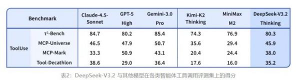 同时,为了将推理能力整合到工具使用场景中,DeepSeek开发了新的合成流程,能够系统性地大规模生成训练数据。这一方法促进了可扩展的智能体训练后优化,显著提升了复杂、交互式环境中的泛化能力和对指令跟随能力。