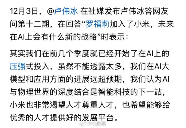 小米卢伟冰回应AI“天才少女”罗福莉加入:小米非常渴望人才、尊重人才,也希望能够给优秀的人才提供好的发展平台。