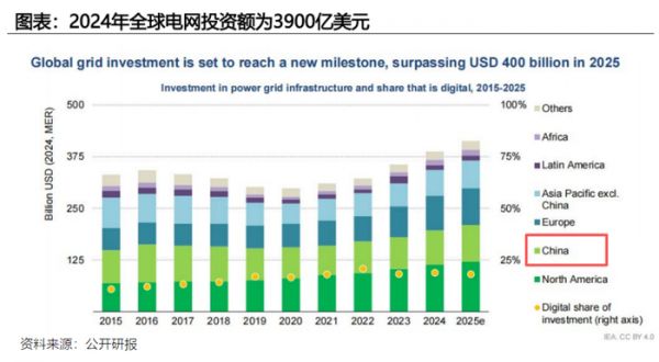2024年,全球电网投资创下3900亿美元新高,国内电网建设额同期达到6083亿元,在全球电网投资中占据主导地位。