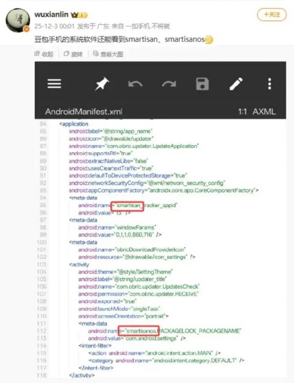 除了看得见的部分,细节还藏在系统代码里。有技术博主曝光:豆包手机的系统代码中赫然写着“smartisan”“smartisanos”“smartisan tracker appid”这些锤子系统的标识。