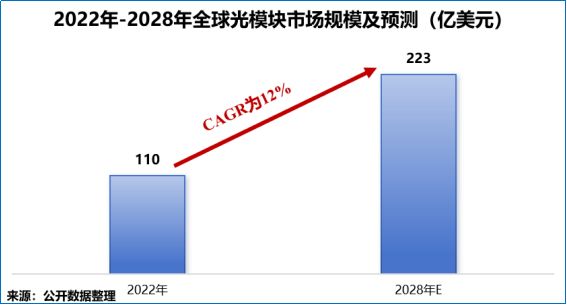数据显示,2022年全球光模块市场规模为110亿美元,预计2028年将增至223亿美元,2022年-2028年的年均复合增速将达到12%。