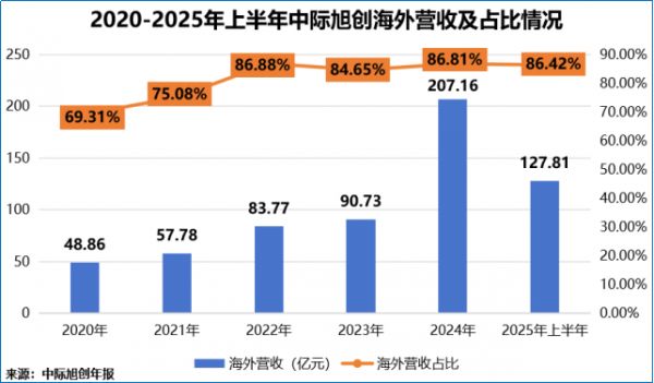 2025年上半年,公司海外业务贡献了127.81亿元的营收,占总营收的86.42%,凸显出海外市场在公司的绝对主导地位。