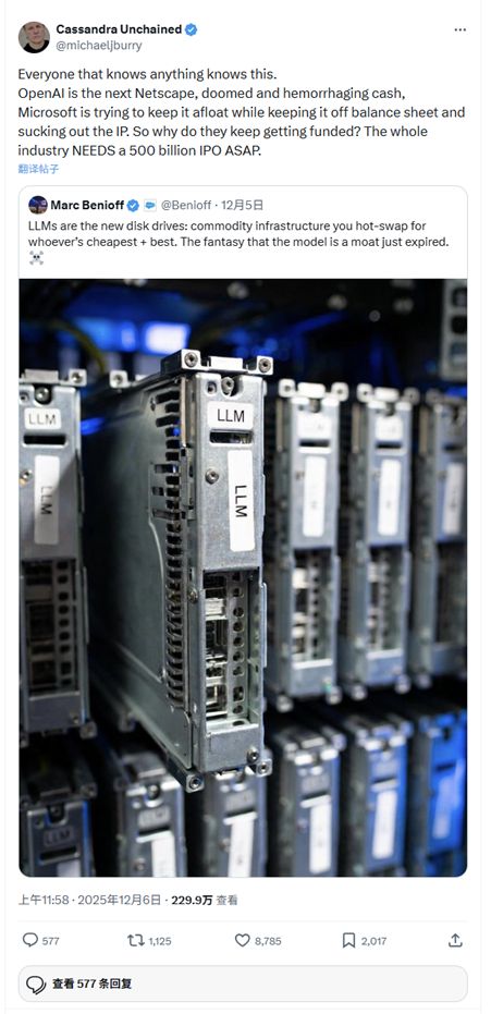 “OpenAI是下一个网景(Netscape),注定要覆灭,而且公司现金正在大量流失,”上周五晚些时候,在回应Salesforce首席执行官Marc Benioff关于大语言模型的帖子时,伯里在X上写道。