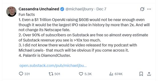 上周六,伯里又在另一条帖子中补充道,即便OpenAI融资600亿美元,也“远远不足以”填补其资金窟窿。