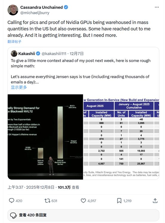 “欢迎大家提供证据,证明英伟达的图形处理器(GPU)正在美国本土及海外大规模囤积。已经有人联系我了,情况正变得有趣起来。但我还需要更多证据。”上周日下午,伯里又发帖称。