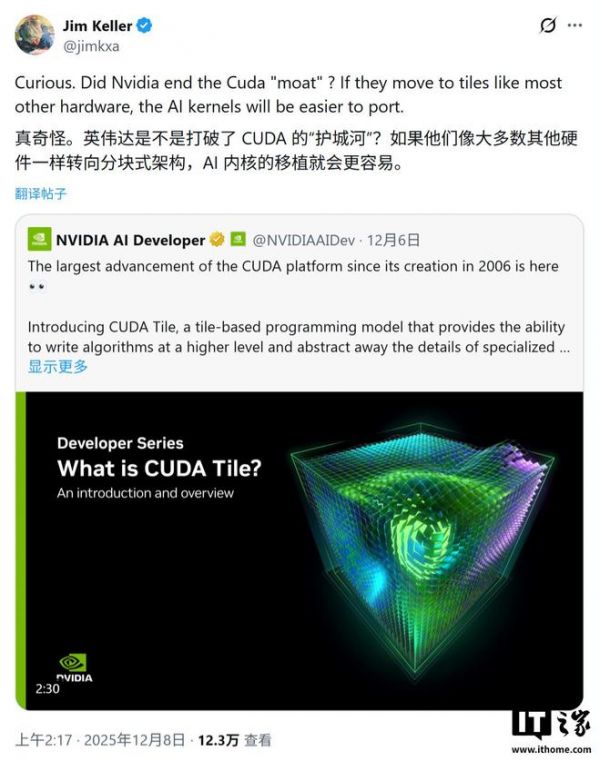 IT之家 12 月 9 日消息,科技媒体 Wccftech 昨日(12 月 8 日)发布博文,报道称传奇芯片架构师吉姆・凯勒(Jim Keller)表示,英伟达最新发布的 CUDA Tile 更新可能会终结其长期建立的软件“护城河”。