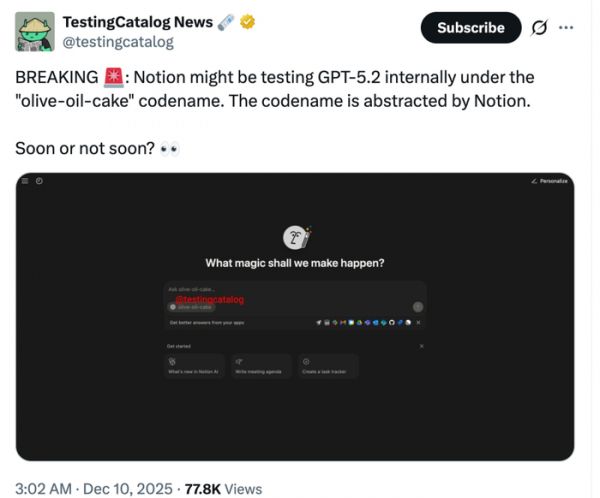 近日,有网友发现 Notion 可能正在内部测试 GPT-5.2,代号为“olive-oil-cake”。此前,有网友表示 GPT-5.2 最新发布日期是当地时间周四。