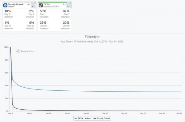 根据 a16z 合伙人 Olivia Moore 前段时间的数据,Sora 留存率远不如 TikTok,首日留存率只有 10%,30 天留存率只有 1%。她认为,模型确实具备病毒式传播的潜力,并且有一批核心用户在制作和导出 Sora 视频。不过,大多数用户并没有在应用上停留。而 Altman 此举,则意味着一次重大的战略纠偏。