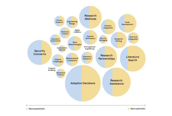 科学家对AI的不同研究环节态度分布。蓝色越多越悲观,黄色越多越乐观,气泡越大代表该主题提及人数越多