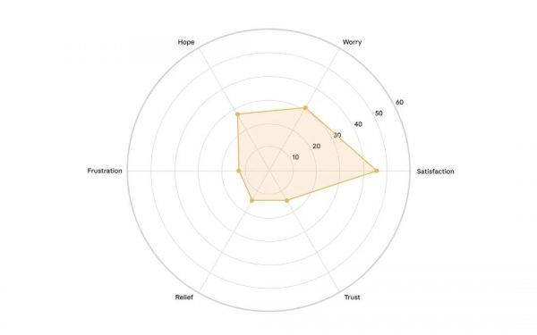 创作者样本的六维情绪雷达图。可以看到满意度很高,但信任和安全感较弱,担忧明显高于其他群体