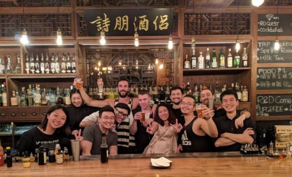 黄胜斌(右4)在台北R&D Cocktail Lab与员工、顾客在一起。图片来源:R&D Cocktail Lab文 | 温世君