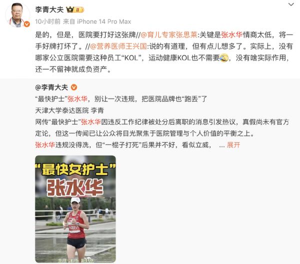 他也支持医院对张水华进行调岗。李青大夫认为张水华可以给医院带来巨大的流量:“她其实是医院天降的健康KOL。从品牌资产方面:全网300万粉丝,话题播放量破10亿,等同每年省下千万广告费;到励志符号:从乡镇姑娘到最快护士,契合健康中国叙事,自带正能量。”