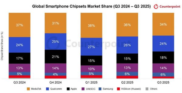 Counterpoint公布了2025年第三季度全球智能手机处理器市场份额数据。