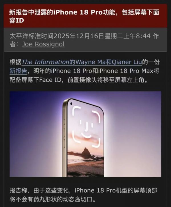 报道中指出,iPhone 18 Pro系列将引入屏下Face ID,将相关模块隐藏到屏幕下方,从而减少屏幕挖孔。