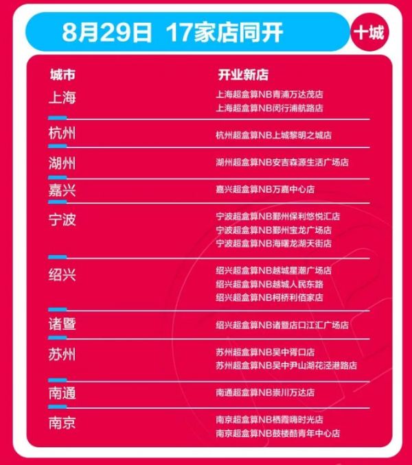 今年8月,盒马旗下硬折扣社区超市品牌“盒马NB”完成升级,更名为“超盒算NB”,独立发展,并作为盒马聚焦的两大核心业态之一,与盒马鲜生形成互补。升级后,首批“超盒算NB”就在江浙沪一日狂开17家。