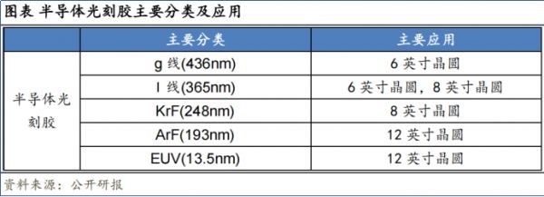 光刻胶有半导体光刻胶、显示面板光刻胶和PCB光刻胶三种,其中,半导体光刻胶按曝光波长不同,可分为g线、i线、KrF、ArF、EUV光刻胶等种类。