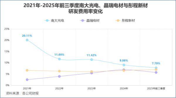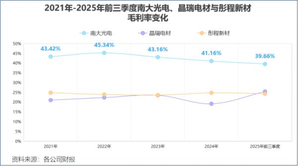 南大光电前驱体业务技术壁垒较高,毛利率常年维持在50%上下,拉升整体盈利能力水平。2025上半年南大光电毛利率为39.66%,比晶瑞电材和彤程新材高出不少。