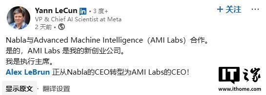“没错,先进机器智能实验室(AMI Labs)是我的新创公司。我担任执行董事长,亚历克斯・勒布伦正从 Nabla 首席执行官调任先进机器智能实验室首席执行官!”杨立昆写道。