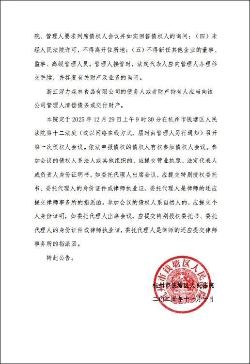 根据杭州市钱塘区法院的公告,债权人需在12月22日前完成债权申报,首次债权人会议定于12月29日召开。