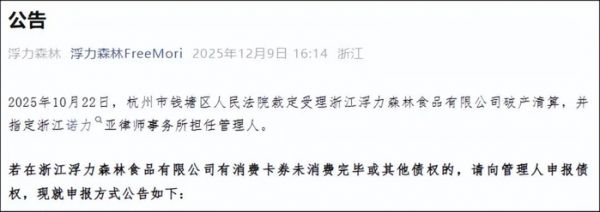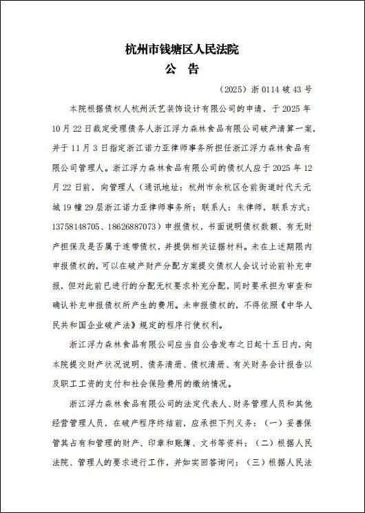 12月8日,浮力森林通过官方公众号发布法院破产公告,宣告这家陪伴杭州消费者20余年的面包品牌正式进入破产清算程序。