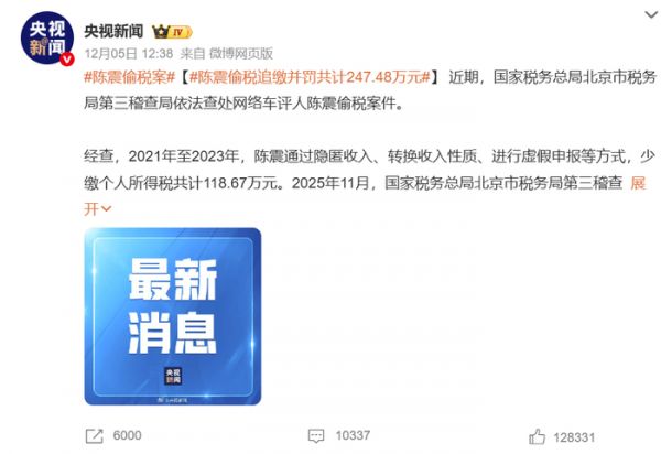 当时大家还在猜是因为他乱说话,结果到了第二天,国家税务总局通报陈震在 2021 到 2023 年期间,通过隐匿收入、转换收入性质、虚假申报等方式少缴个人所得税118.67 万,连本带罚共计 247.48 万,已全部追缴入库。
